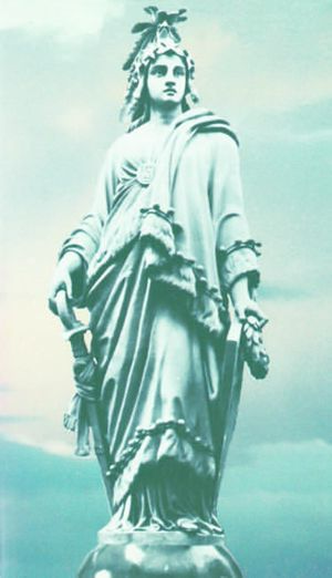 Armed Freedom, a statue depicting the Goddess of Freedom, crowns the dome of the United States Capitol. The statue, which has come to be known as the Statue of Freedom, portrays the goddess dressed in flowing robes, her right hand upon the hilt of a sheathed sword, her left hand holding a laurel wreath of victory and a shield with thirteen stripes. Her head is covered by a helmet encircled with stars and surmounted by a crest composed of an eagle’s head and feathers. Her robes are secured by a broach inscribed “U.S.” and she stands atop a globe encircled by the words E Pluribus Unum.