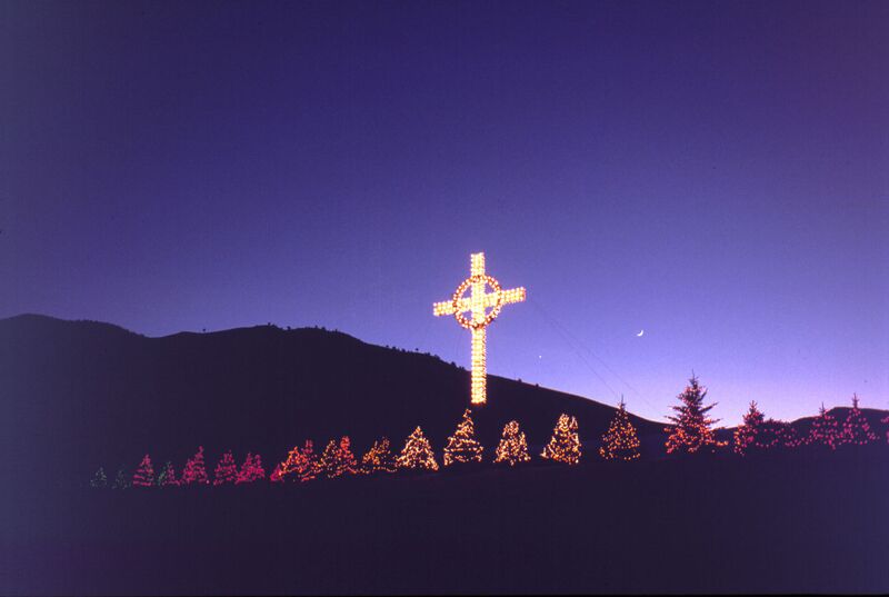 The cross erected in 1995 at Ranch Headquarters. The trees on the berm are lit with lights in the colors of the causal body.