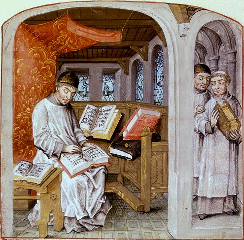 Miniature from a manuscript of De imitatione Christi, showing Thomas à Kempis writing (left) and with a brother (right).