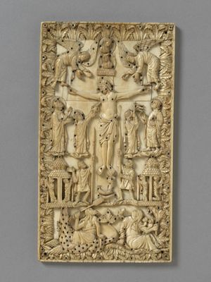 Ivory panel depicting the crucifixion of Christ (c. 860–870, France). Joseph of Arimathea is shown on the left holding up the Holy Grail to catch the blood issuing from the side of Jesus. This and other similar carvings show that the belief that Joseph caught the blood of Jesus can be traced back centuries before the first Grail romances.