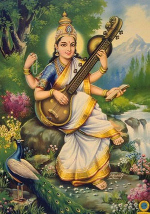 Parthasarathy writes: “The Goddess, therefore, represents the ideal guru.... ‘Sitting on the lotus’ symbolises that the teacher is well established in the subjective experience of the Truth. ‘Holding the Scriptures in her hand’ indicates that she upholds that the knowledge of the Scriptures alone can take us to the Truth." Parthasarathy says that Sarasvati’s playing of the lute suggests “that a truly qualified teacher tunes up the mind and intellect of the seeker and draws out of him the music and melody of life.”[2]
