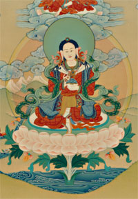 Some years earlier, Trisong Detsen had invited the Precious Guru to come to Tibet to overcome the forces of the entrenched Bon religion that were opposing the establishment of Buddhism by their black magic. Padma Sambhava came to Tibet and stayed for fifty-five years. Trisong Detsen was so eager to receive teaching from his guru that on one of Padma Sambhava’s visits, he offered him his entire kingdom, including his wives. Padma Sambhava requested a woman committed to the Dharma to assist him in his practice of the secret teachings. The king gave him Yeshe Tsogyal, who was then sixteen years old.