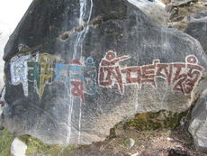 Throughout Tibet and Ladakh, Buddhists have inscribed OM MANI PADME HUM on flat prayer stones called “mani-stones” as votive offerings in praise of Avalokitesvara. Thousands of these stones have been used to build mani-walls that line the roads entering villages and monasteries.