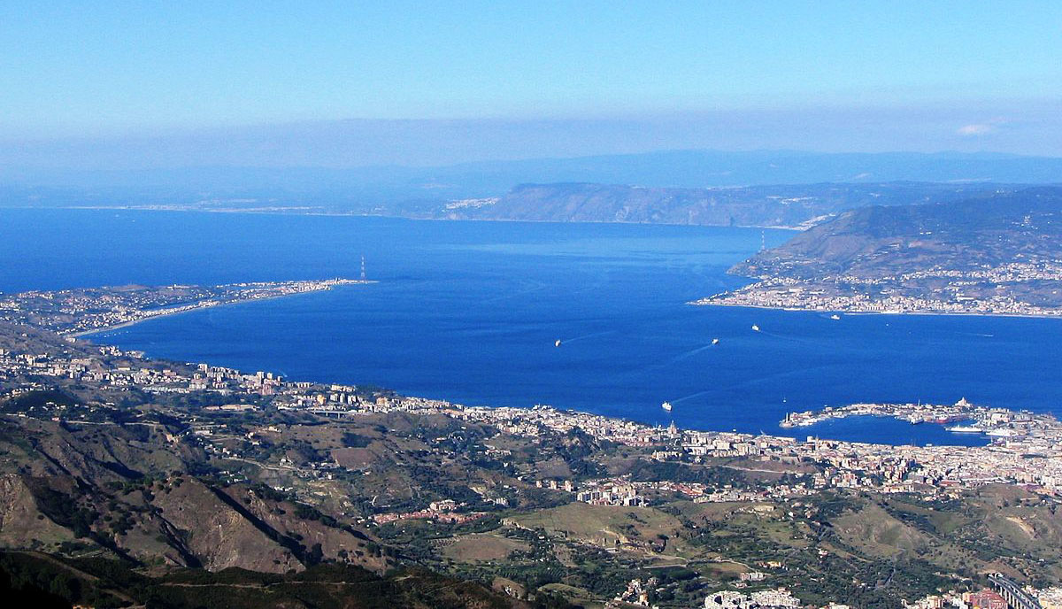 The city of Messina, with the mainland of Italy on the other side of the Strait of Messina